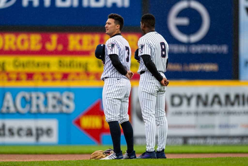 Reading Fightin Phillies V Somerset Patriots - MLB, Baseball Herren, USA Baseball Anthony Volpe and Marco Luciano of the Somerset Patriots stand for the national anthem before a Minor League Baseball game at TD Bank Ballpark in Bridgewater, United States, on April 19, 2026. Bridgewater United States PUBLICATIONxNOTxINxFRA Copyright: xDanxSquicciarinix originalFilename:squicciarini-readingf260419_npnzF.jpg