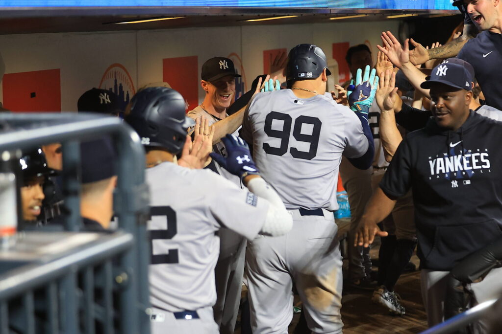 MLB, Baseball Herren, USA New York Yankees Vs New York Mets Aaron Judge 99 of the New York Yankees is being congratulated after hitting a grand slam home run during the eighth inning of the baseball game against the New York Yankees at Citi Field in Corona, N.Y., on June 25, 2024. New York N.Y. United States PUBLICATIONxNOTxINxFRA Copyright: xGordonxDonovanx originalFilename:donovan-newyorky240625_npZ1n.jpg